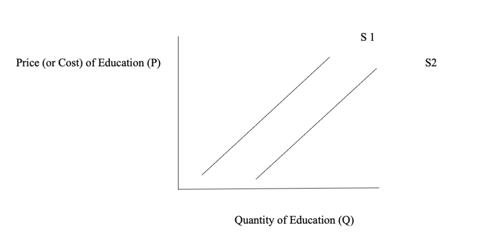 Government subsidy makes the curve move to the right, increasing the quantity of education to Q. It covers part of the cost, reducing the price students pay to P. As a result, more students can afford higher education, leading to higher enrollment in STEM disciplines and other areas supported by the government.